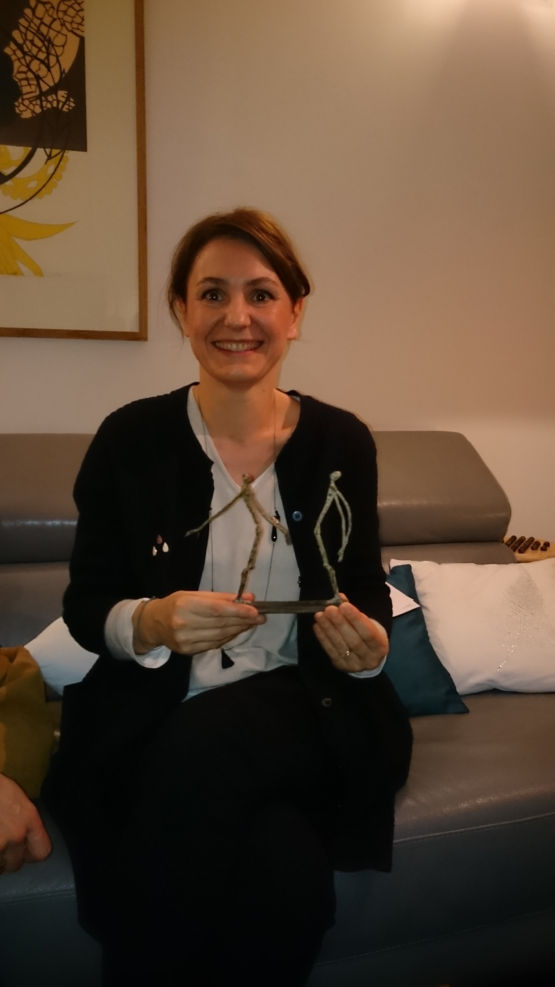 – « Un soir de pleine lune » de Sophie Pigeon (sculpture bronze 1/8 2015) avec sa petite lampe achetée par Hélène pour apprécier les ombres crées par cette magnifique création. Deux corps en relation qui ne se touchent pas, belle patine. Acquise pour 600€.