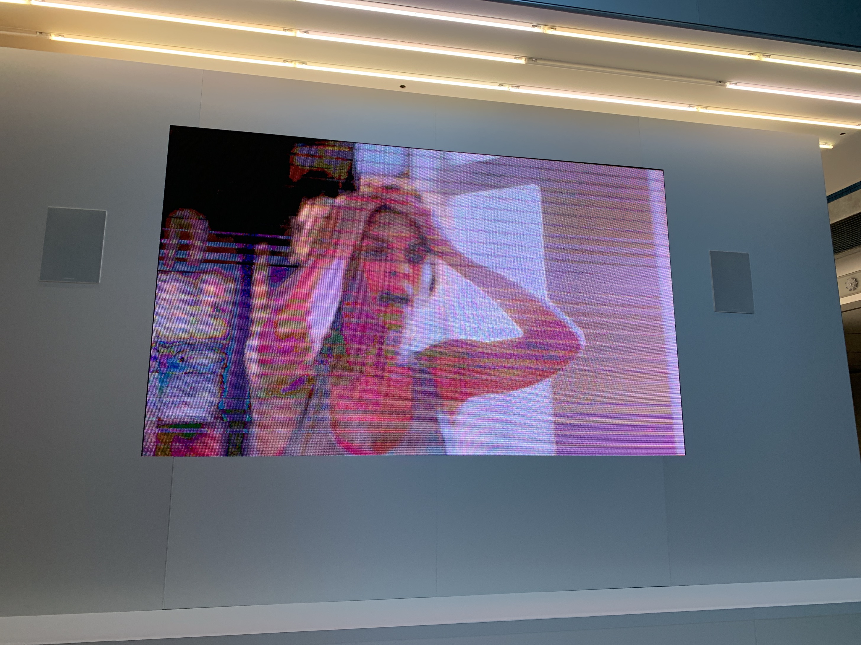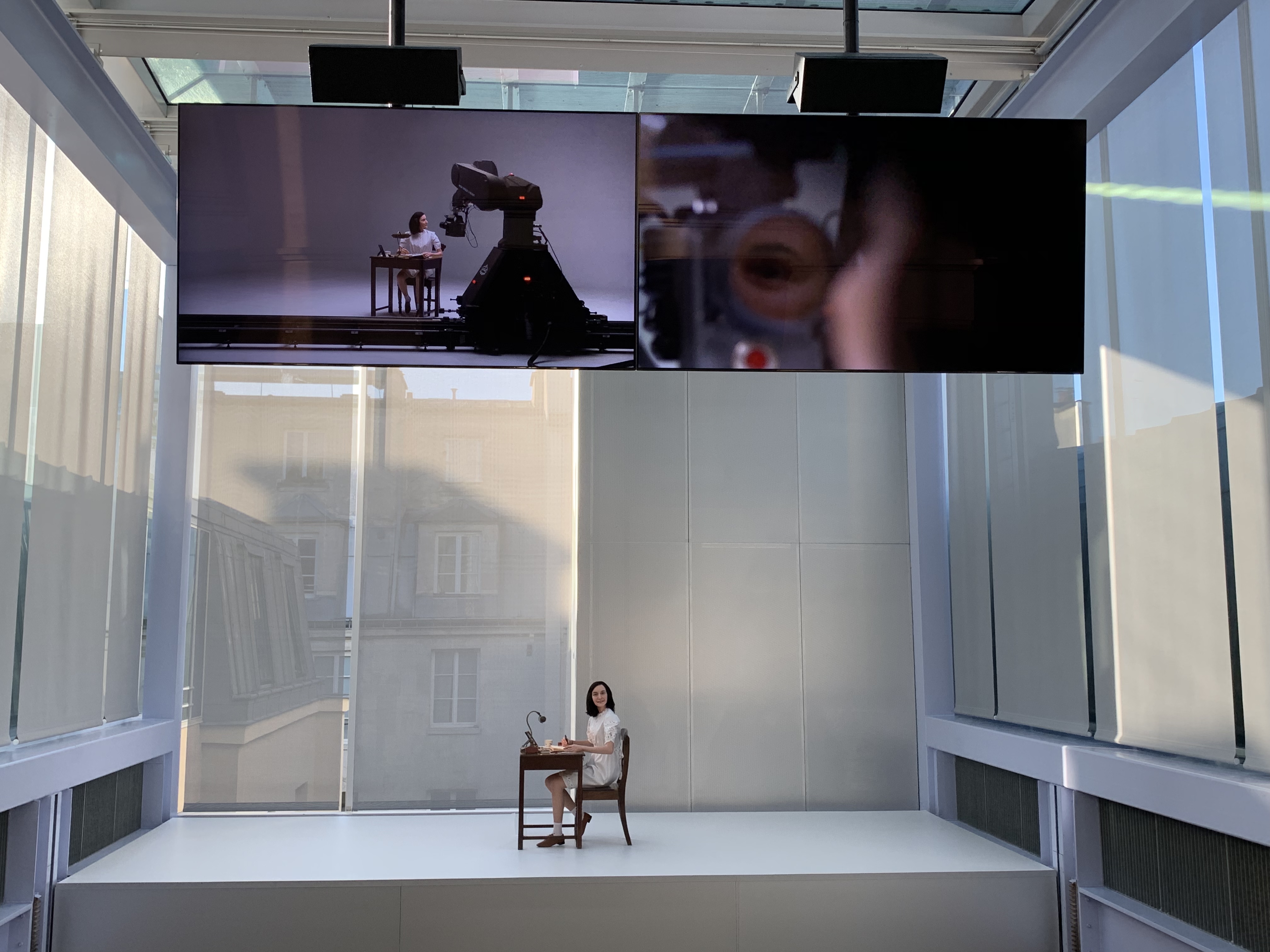 Au 2ème étage : « Likeness » (2018), c’est une statue de cire d’Anne Franck à son bureau en train d’écrire son journal filmée par un robot qui tourne autour de l’oeuvre. La statue est inspirée de la statue de Mme Tussaud elle même produite à partir des quelques photos en noir et blanc que l’histoire nous a laissé. Simon Fujirawa s’attaque certes à une image collective et à notre société de l’image à l’heure de la VR et de la Réalité Augmentée.