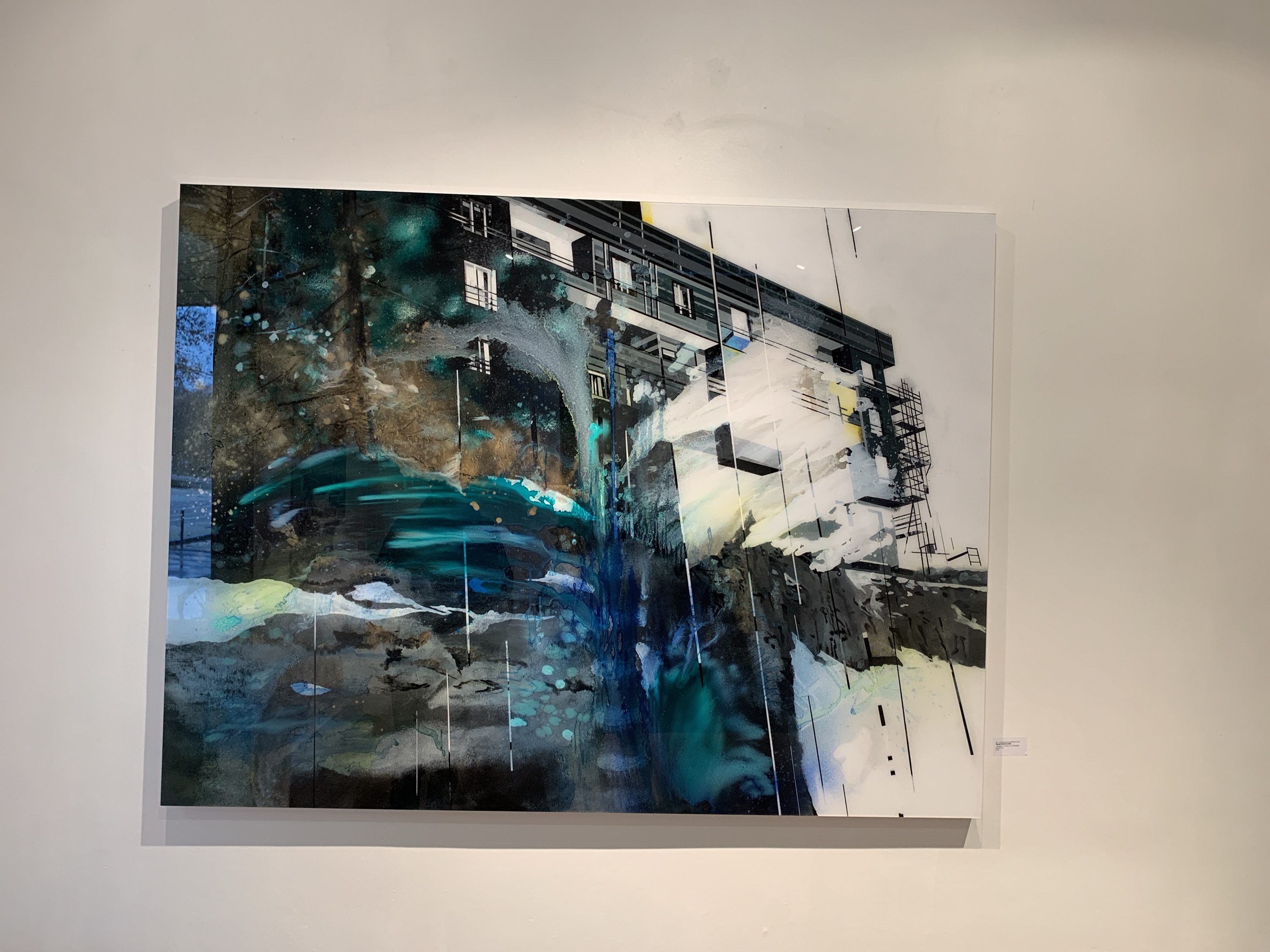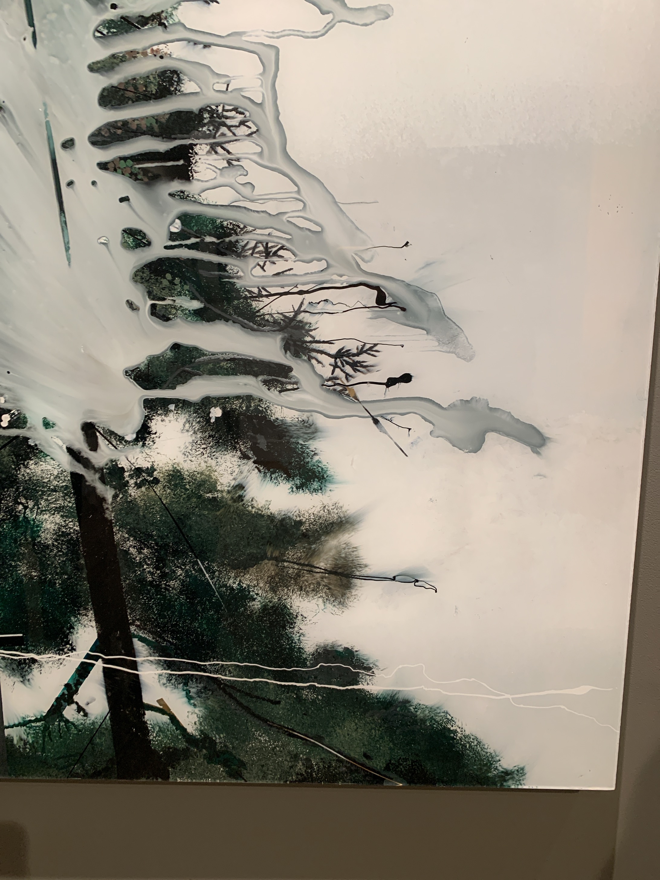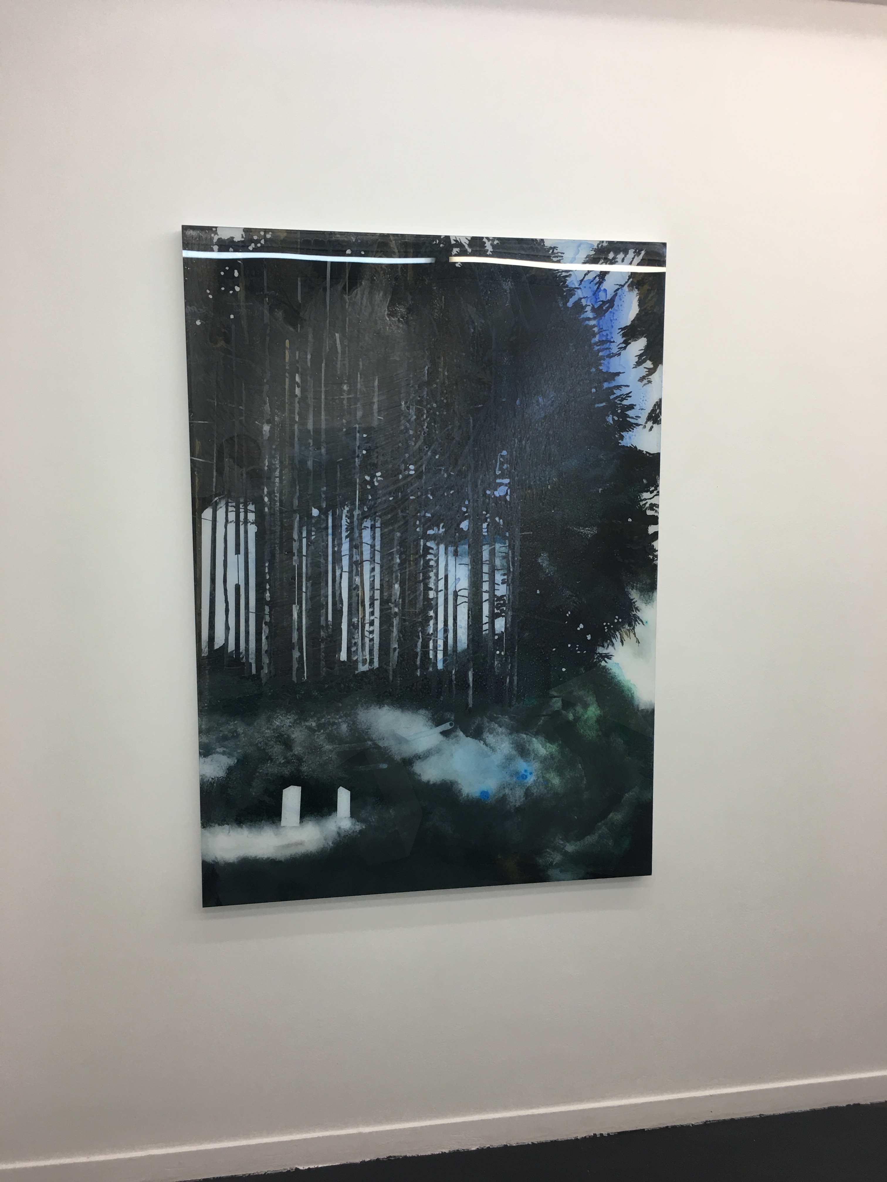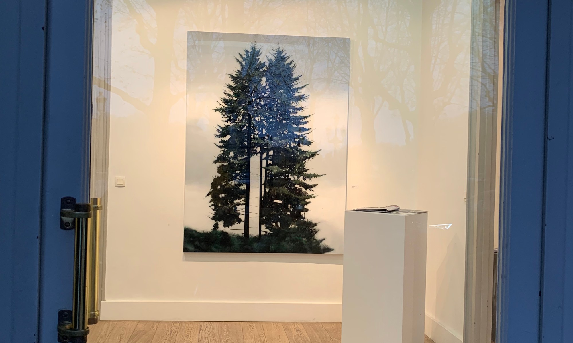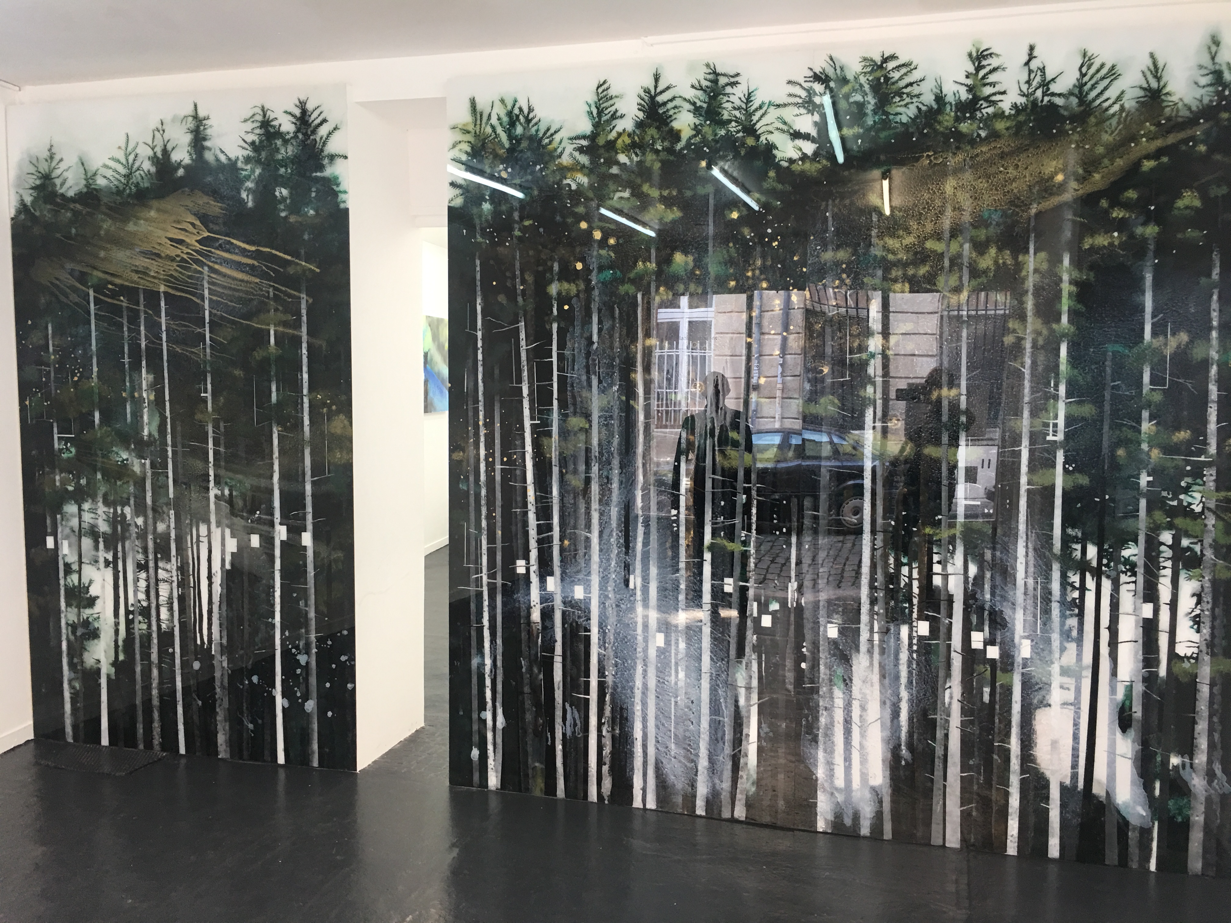 En entrant dans la galerie nous faisons face à une oeuvre très puissante. Deux arbres ? En regardant de plus près, nous en distinguons jusqu’à 7, tous plus vrais que nature. En s’approchant encore davantage on aperçoit des branches rectilignes imaginaires, métalliques dixit l’artiste. Nous contemplons des nuances de vert très subtiles et même des reflets dorés. L’artiste est parti de photos puis a laissé son imaginaire prendre le relais.