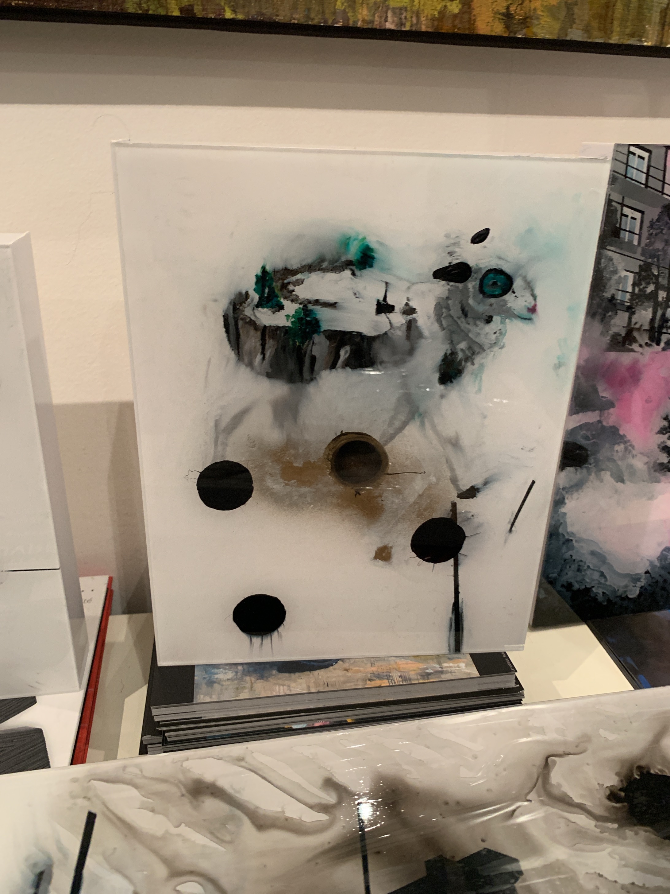 Mais c’est tout l’inverse que crée l’artiste avec une technique affinée depuis plus de 20 ans. Ce n’est que de la peinture. L’artiste se place derrière le support en Plexiglas et peint ´à l’envers’ en commençant par le 1er plan. L’artiste se projette dans notre regard. Et chacune de ses oeuvres a plusieurs visages selon la position de notre regard.